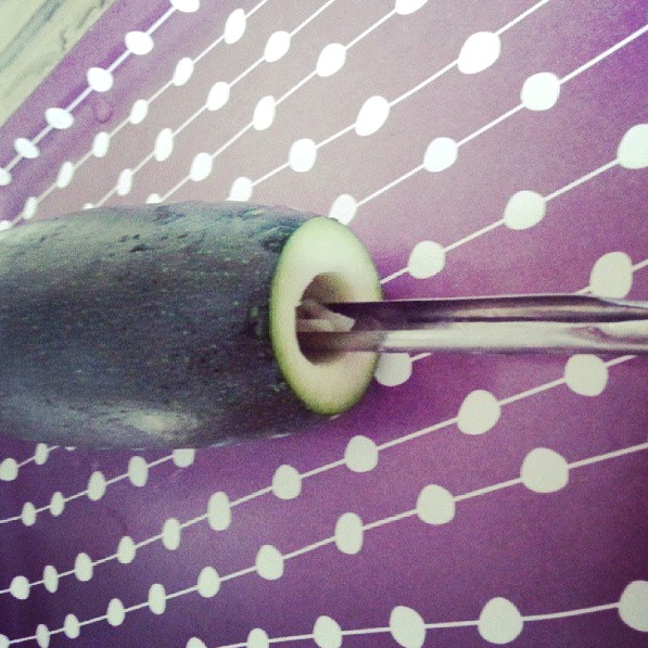 Während der Reis vor sich hinkocht könnt Ihr dann die Zucchinis aushöhlen. Ich mache das immer mit einem stylishen Zucchini-Aushöhler, den ich mir beim letzten Nablus-Besuch für 2,-€ zugelegt habe. Da das dazugehörige Flugticket aber leider etwas teurer ist, könnt Ihr das Ganze auch mit einem Sparschäler machen. Aus dem Inhalt könnt Ihr übrigens noch anderes Futter machen, zum Beispiel ein Süppchen. Nicht wegschmeißen, das ist böse!