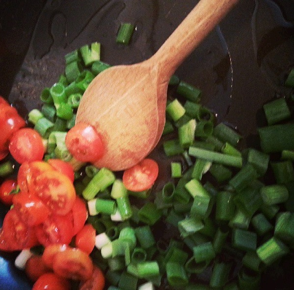 Dann könnt Ihr schon mal den Rest für die Füllung anbraten: Ich habe glaube ich drei Lauchzwiebeln und eine Handvoll Cherry-Tomaten in Olivenöl mit einem Schuss Harissa scharf angebraten, dann mit Salz/Pfeffer/Ras el-Hanout/Paprika gewürzt (und, ich gebe zu, ich bin von der Fraktion: Viel hilft viel).