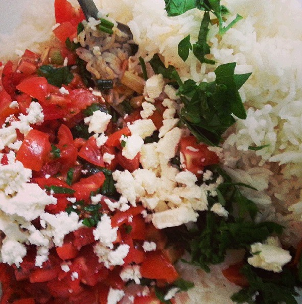 Dann das Zeug aus der Pfanne mit dem Reis vermengen und den Feta reinbröseln. Ich schnippel zusätzlich immer noch kleine Tomaten und glatte Petersilie frisch mit rein. Veganer können statt Feta natürlich Tofu verwenden (den würde ich, schlimm wie ich bin, mit Hackepeter-Gewürzzeug pimpen). Und dann nochmal ordentlich nachwürzen und abschmecken. Dann sieht das Ganze so aus: