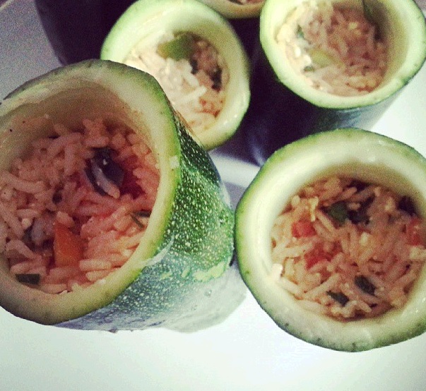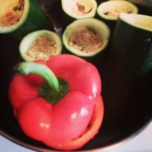 Mit Mengenangaben sieht es leider wie immer schlecht aus. Ich habe etwa sieben mittelgroße Zucchini gefüllt und dafür zwei Tassen Reis (auf jeweils eine Tasse Wasser mit einem Schuss Olivenöl und einem Schuss Reis) halb-gar gekocht. Das todsichere Reisrezept für Unfähige werde ich auch irgendwann nochmal posten. Halb-gar bzw. al dente reicht deswegen, weil der Reis nochmal während der Garzeit für die Zucchini nachzieht.